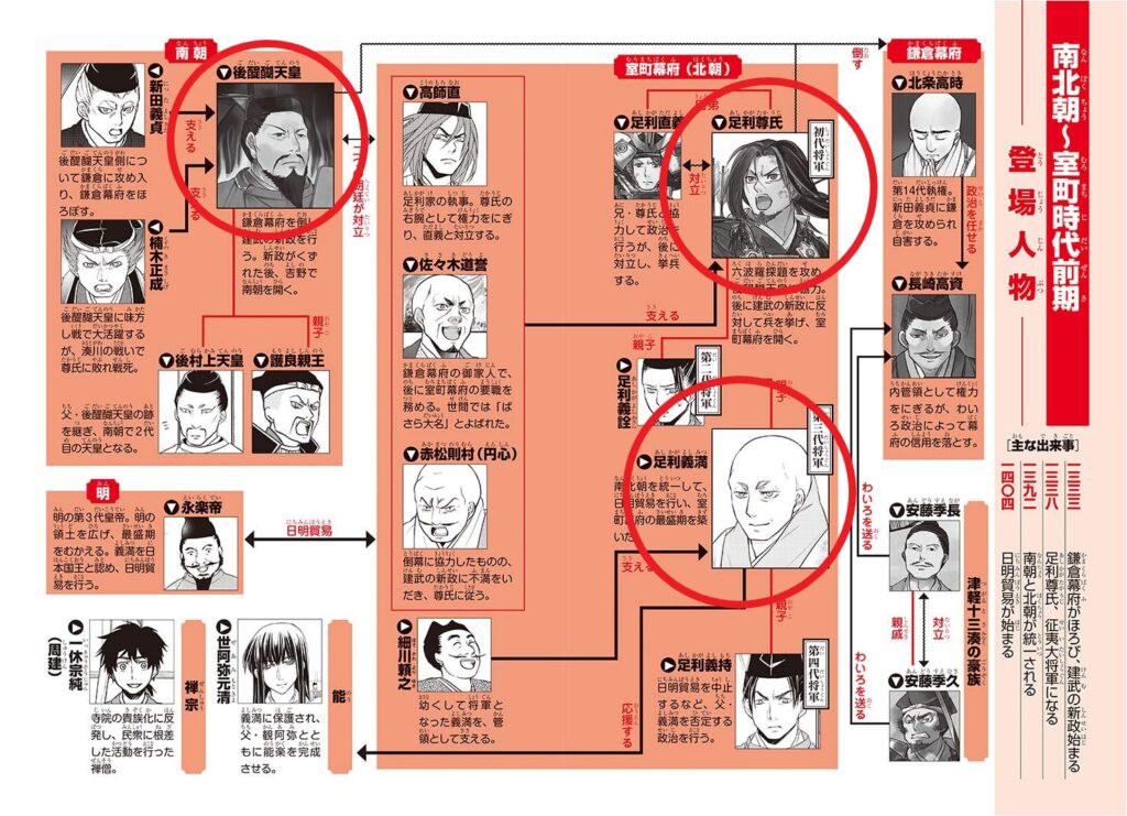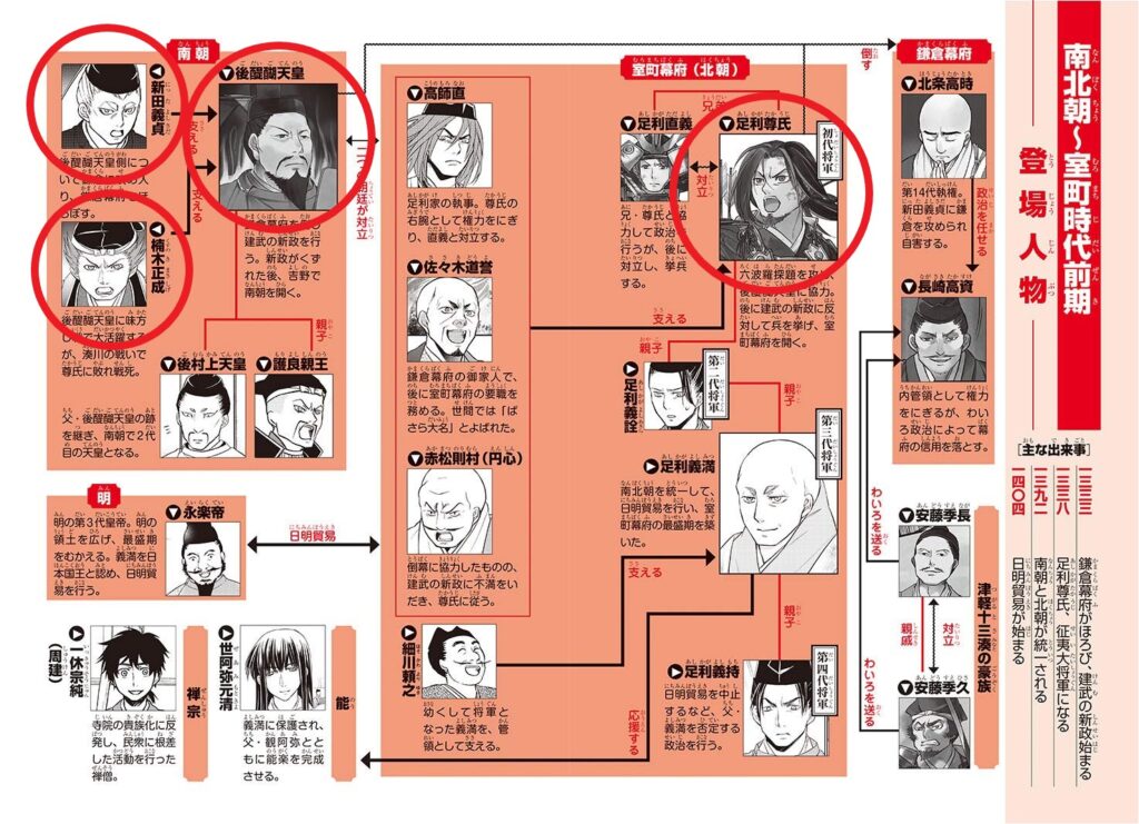 この章のメインは後醍醐天皇!足利尊氏と一緒に鎌倉幕府を倒して、今度は自分で政治を始めるんだよ。天皇中心の政治でやりたい放題するんだ。その政治を面白く批判したシーンもあるから読んでみて。幕府で活躍した武士たちへの恩賞も少なかったから、徐々に武士たちから不満が出始めるんだ。