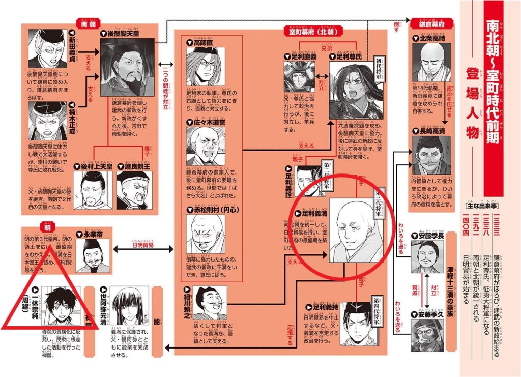 この章のメインは足利義満!前回の章の終わりで南北朝を統一したところまで出てきたね(と言ってもだいぶ前だけど)。今回は出家した義満がメインだよ。